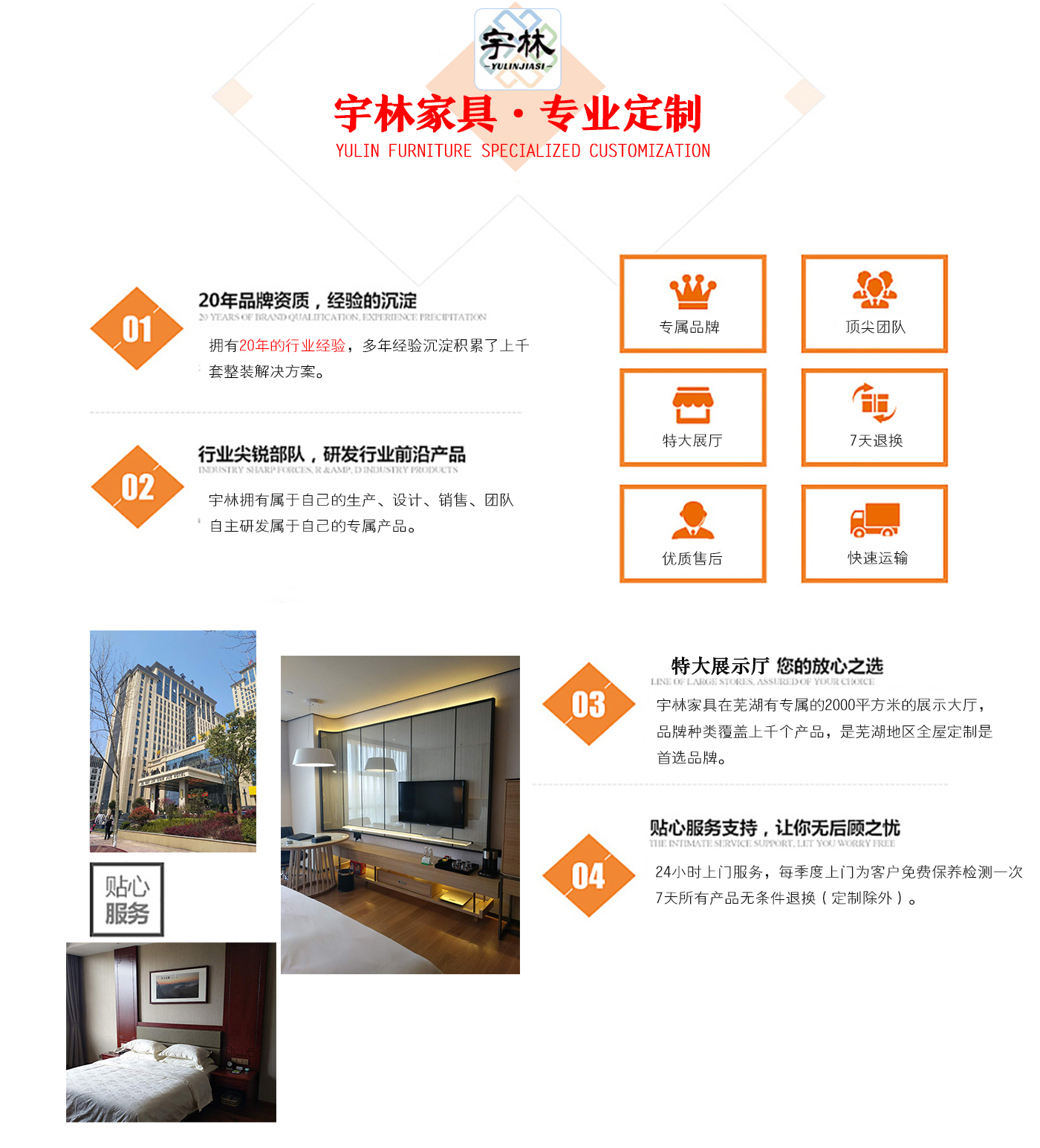 蕪湖宇林工貿(mào)有限公司創(chuàng)建于1996年,位于蕪湖高新技術(shù)開發(fā)區(qū)南區(qū),占地面積13000余平方米。是一個集研發(fā)、設計為一體的綜合性公司,公司主營整體家居定制、酒店家具定制、娛樂場所配套家具以及軟體系列,團隊,銳意革新、進去不息的理念,逐漸成為蕪湖家具行業(yè)的生產(chǎn)廠家,并在2006年注冊了“宇林”牌商標。宇林品牌家具依現(xiàn)代與古典相結(jié)合的多種實木家具、實木貼皮家具。家具做工精細,多用人工雕刻;其自然、典雅的風格在很大程度上引導著人...